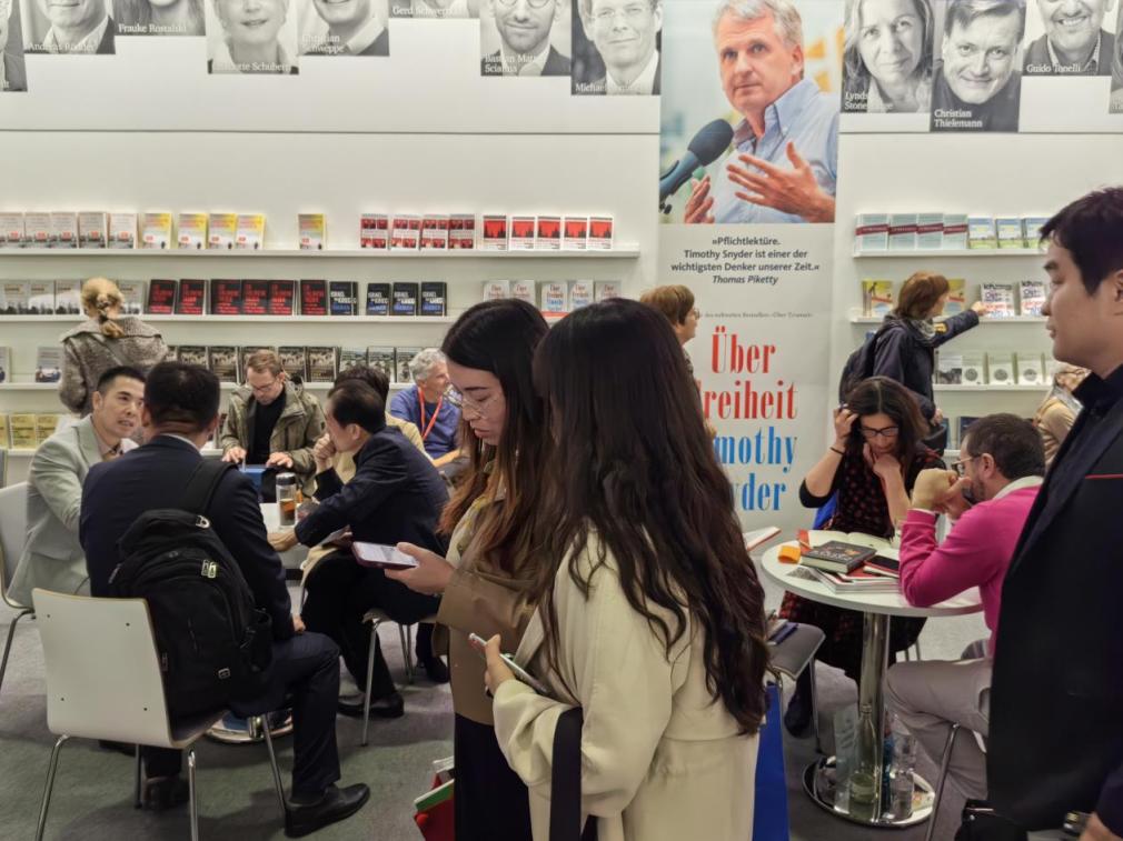 中国嘉宾在2024法兰克福国际书展现场与欧洲出版公司嘉宾洽谈合作项目之一