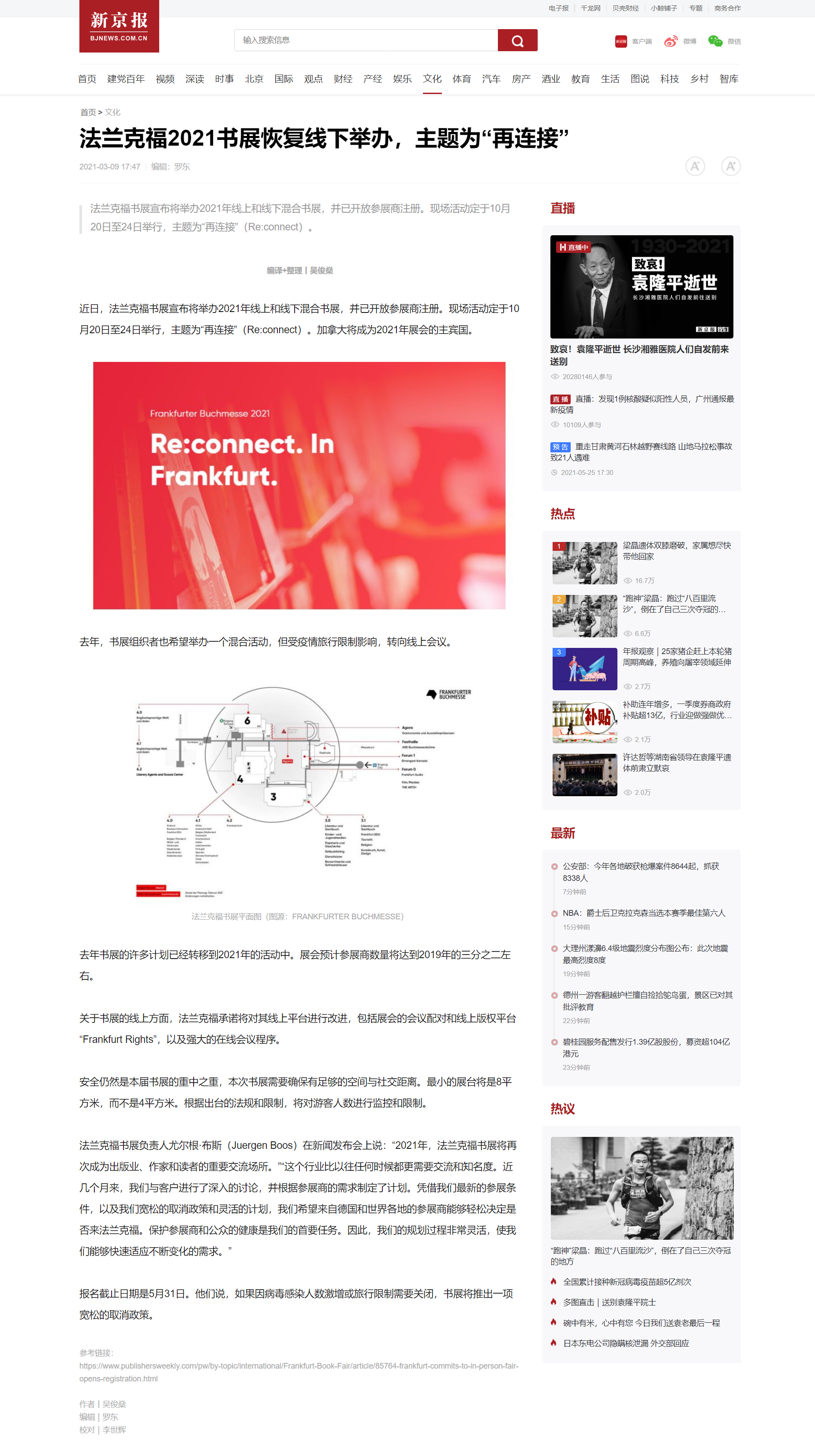 法兰克福2021书展恢复线下举办,主题为“再连接”