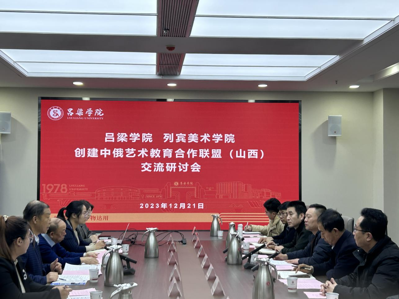 2023年12月21日,吕梁学院拟与列宾美院合作项目暨创建中俄艺术教育合作联盟交流研讨会在吕梁学院召开。本次会议由中华出版促进会文化出版合作国际事务工作委员会和吕梁学院主办。中华出版促进会文化出版合作国际事务工作委员会主任委员李大伟、吕梁学院副院长王三虎、吕梁学院合作交流处处长李月平、艺术系主任张云奇、吕梁市离石区人大常委会原主任乔拯民等出席会议,会议由吕梁学院合作交流处处长李月平主持。